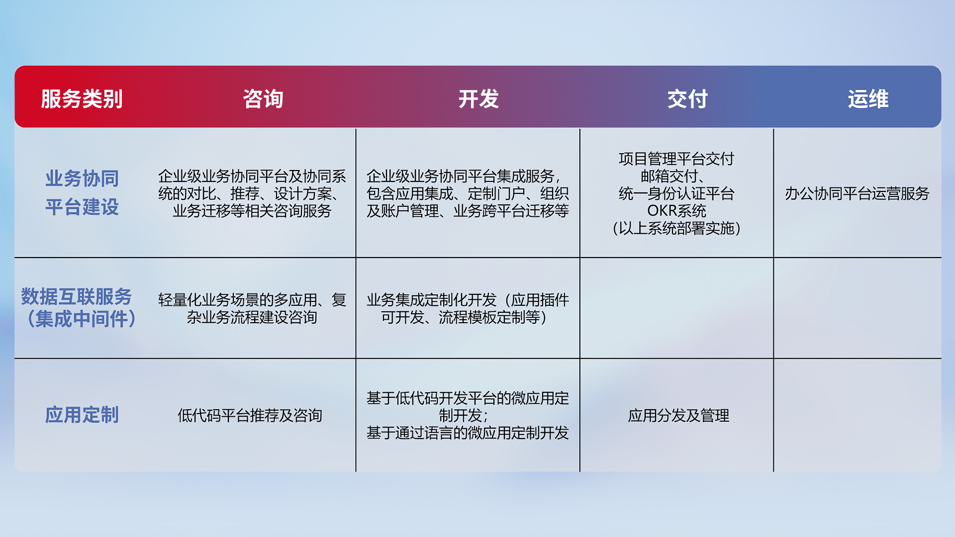 针对钉钉、、、、企微、、IDaas等平台级产品提供产品的规划、、、、方案、、、、交付、、、定制化开发等服务,,,实现如统一协同办公、、、、智能客户服务、、、混合会议管理、、、智能数据查询、、、等业务场景,,,,实现数字化转型。。。