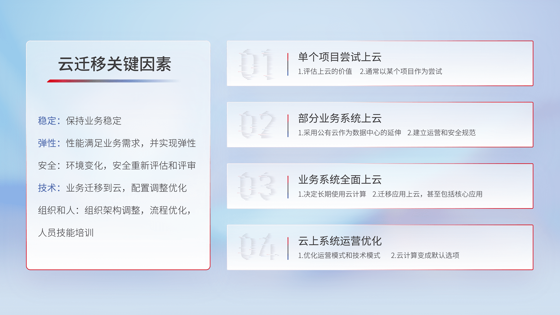 结合实际业务,,,从规划设计、、、、云平台选型、、云原生改造、、、数据迁移、、、、集成交付,,,迁移全过程为客户识别最佳上云路径,,,做好风险识别管理,,,,设计网络架构、、、身份权限、、、、安全审计合规、、操作审计、、日志审计、、、、监控告警策略、、、、多站点容灾设计等,,,,对云上基础设施进行整体规划,,提升IT治理水平,,以满足弹性、、、、高可用、、高性能的需求。。。