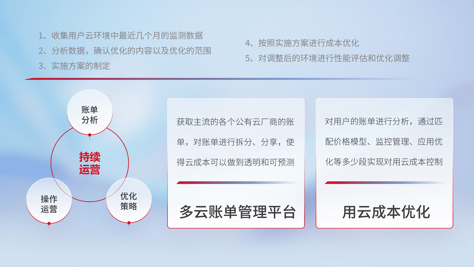 通过多云纳管,,,,以统一的资源数据模型把客户的云资源进行抽象和封装,,,进而实现对多云资源的统一操作,,保障云资源管理的可靠性、、、、稳定性与可用性。。。。量身定制化运维内容,,配置、、、、开发运维、、、、补丁管理、、、备份、、、、监控、、、认证和访问管理、、审计和日常巡检等,,保障在用云过程中的可靠度,,稳定度以及高可用率。。